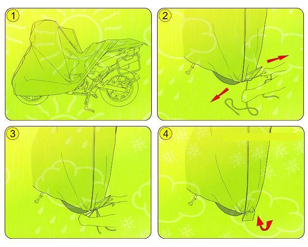 4. Поместите выступающие части веревки в карман. Набор содержит: -1 чехол для мотоцикла, -1 удобный пакет для хранения и транспортировка брезента